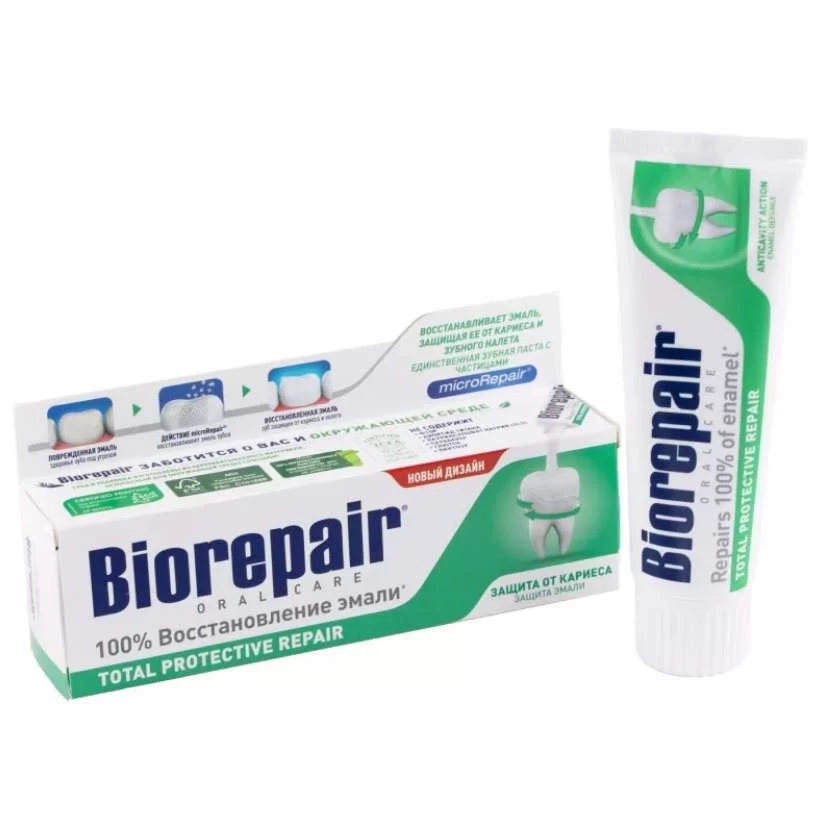 Далее в наш рейтинг зубных паст попадает BioRepair Total Protective Repair, и в этом обзоре мы разберем, что делает ее особенной. Итак, эта зубная паста предлагает комплексный уход за вашей улыбкой. BioRepair Total Protective Repair включает в свой состав уникальные микрочастицы microRepair, которые идентичны структуре и химическому составу зубной эмали и дентина. Как это работает? Эти микрочастицы проникают в микротрещины, восстанавливают поврежденную эмаль и запечатывают открытые дентинные канальцы, сразу снижая чувствительность зубов. Более того, они создают дополнительный слой на поверхности эмали, который надежно защищает ваши зубы на 24 часа, даже в условиях механического или химического воздействия. Зубная паста BioRepair также эффективно снимает налет, используя неабразивную силику. Ваши зубы становятся гладкими и блестящими на 12-18 часов. Средний уровень абразивности (RDA) составляет 60, обеспечивая щадящее очищение. Кроме того, эта паста обладает антибактериальной защитой. Частицы microRepair включают ионы цинка, которые подавляют размножение бактерий и кариес, восстанавливая уровень кислотности pH и обеспечивая свежее дыхание.