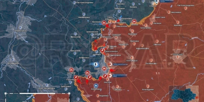 В самом Бахмуте идут бои в районе Мариупольского кладбища, штурмовикам ЧВК «Вагнер удалось перерезать снабжение ВСУ на трассе Бахмут-Константиновка.