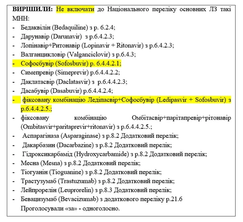 В итоге в Национальный перечень не попали софосбувир (Sofosbuvir) и фиксированная комбинация ледипасвир+софосбувир (Ledipasvir + Sofosbuvir) по причине его высокой стоимости и новизны.
