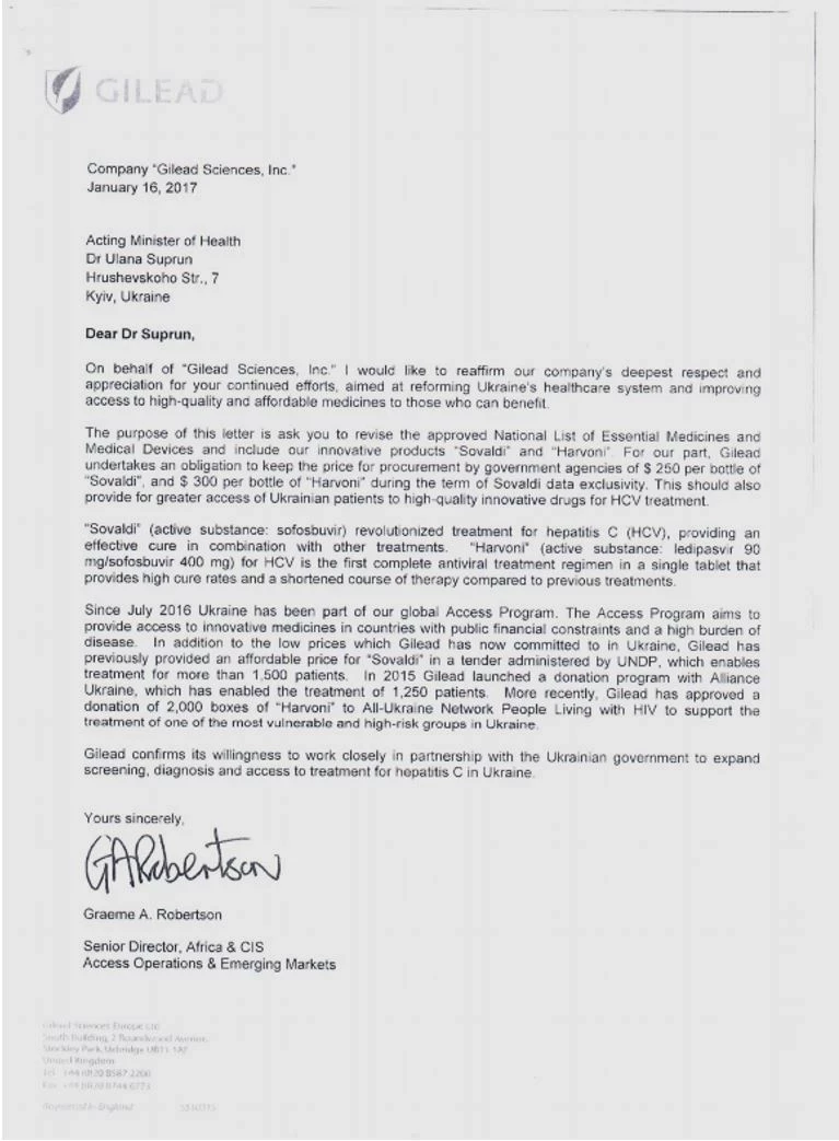 Меньше чем через месяц, в январе 2017 года, в адрес главы минздрава поступило письмо от Грема А.Робертсона, генерального директора операций по доступу на рынках развивающихся стран Африки и СНГ корпорации «Gilead Sciences. В письме господин Робертсон просит Ульяну Супрун пересмотреть решение и включить препараты на основе софосбувира в Национальный перечень.
