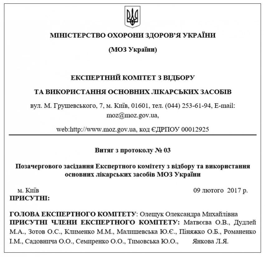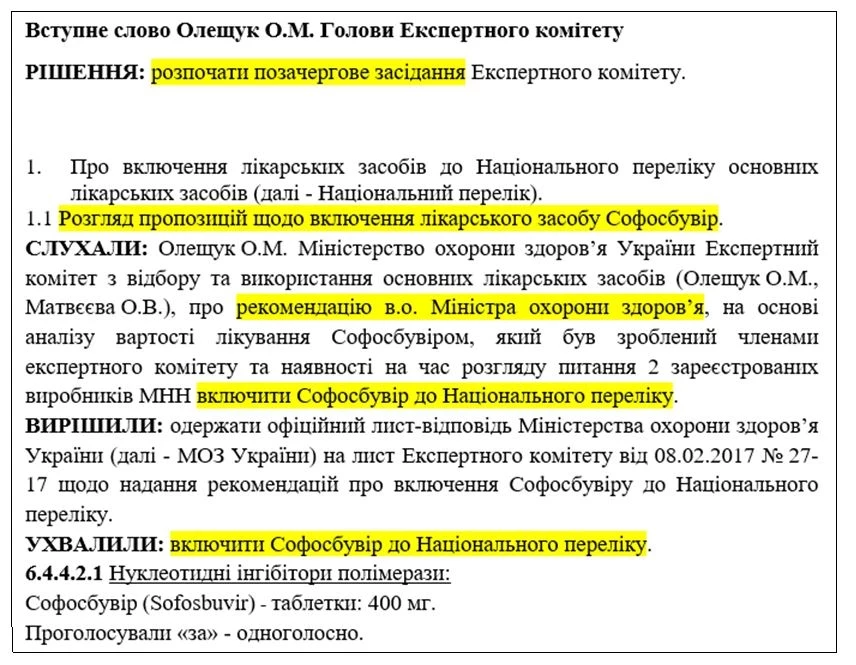 Мне не известно, какую выгоду получила от этой «сделки Ульяна Супрун, но спустя всего месяц, в феврале 2017 года, Экспертный комитет провел внеочередное совещание, на котором принял решение о включение препарата софосбувир в Национальный перечень. При этом члены комитета открыто указали в протоколе, что препарат был внесен в список по личному ходатайству и.о. министра здравоохранения.