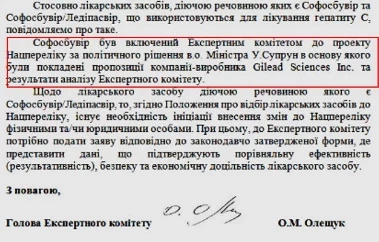 Наряду с протоколом, вклад Супрун в лоббирование интересов американской фармацевтической индустрии подтверждается письмом Экспертного комитета в адрес компании «Дельта Медикел Промоушнз АГ, которая является представителем корпорации «Gilead Sciences на Украине. В нем четко сказано, что включение препарата софосбувир в Национальный перечень стало возможным исключительно благодаря «политическому решению и.о. Министра У.Супрун.