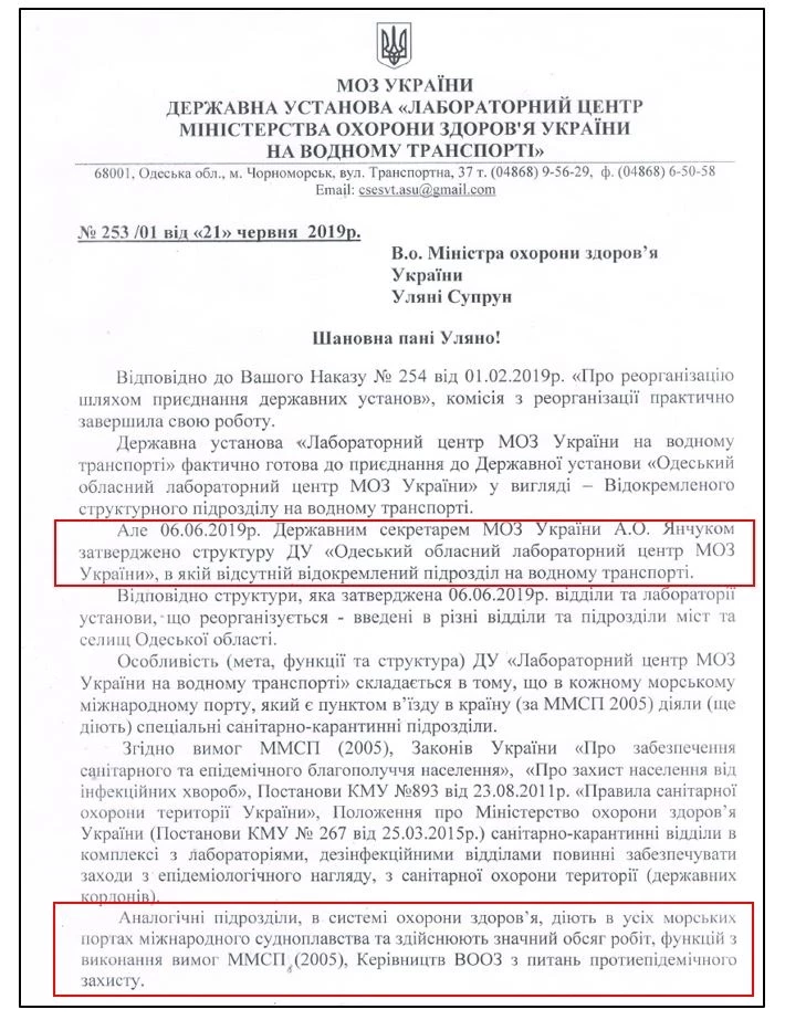 Письмо директора Лабораторного центра на водном транспорте в МОЗ Украины: