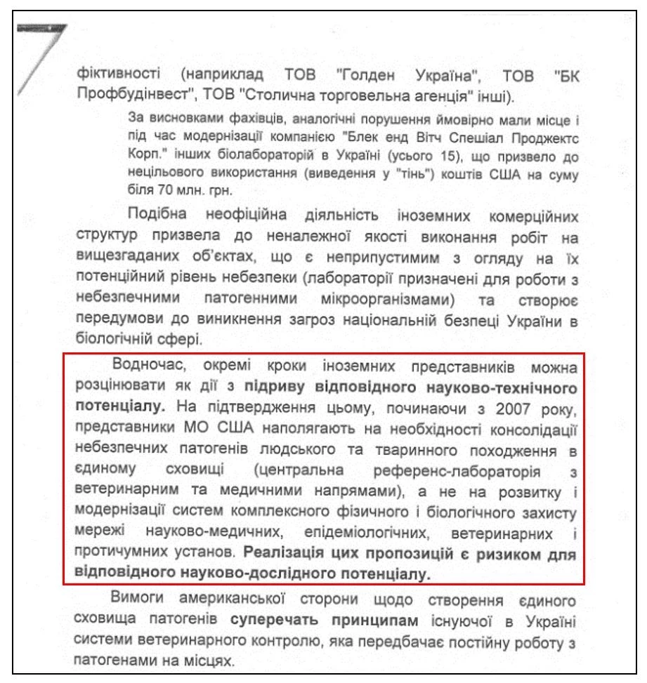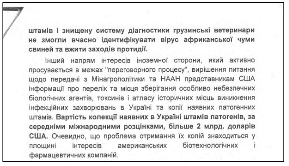 «…отдельные шаги иностранных представителей можно расценивать как действия по подрыву соответствующего научно-технического потенциала… Требования американской стороны по созданию единого хранилища патогенов противоречат принципам существующей в Украине системы ветеринарного контроля, которая предусматривает постоянную работу с патогенами на местах… Реализация этих предложений несет риск для соответствующего научно-исследовательского потенциала.