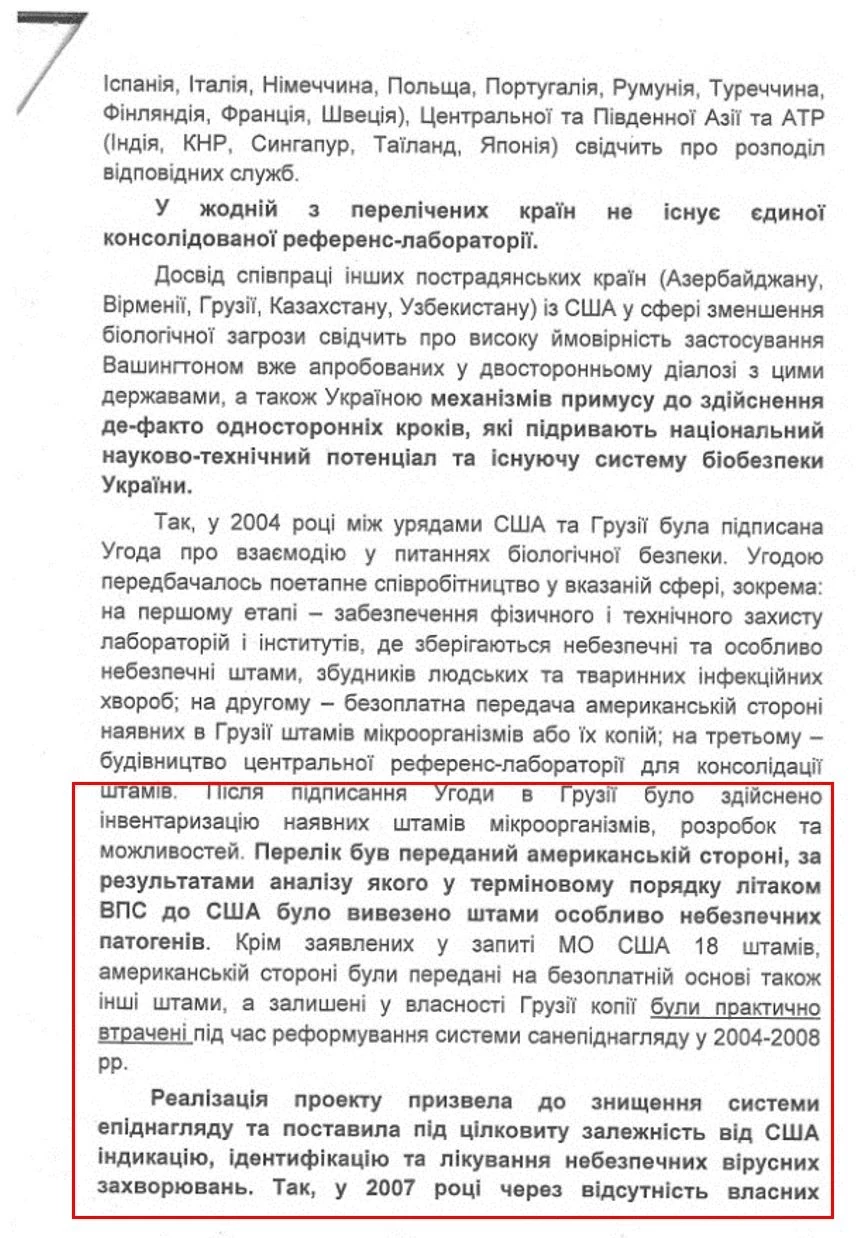 «…В Грузии была проведена инвентаризация штаммов микроорганизмов, разработок и возможностей. Перечень был передан американской стороне, по результатам анализа которого в срочном порядке самолетом ВВС в США были вывезены штаммы особо опасных патогенов. Кроме заявленных в запросе МО США 18 штаммов, американской стороне были переданы на безоплатной основе также иные штаммы, а оставшиеся в Грузии копии были практически утрачены во время реформирования системы санэпидемнадзора в 2004-2008 гг.