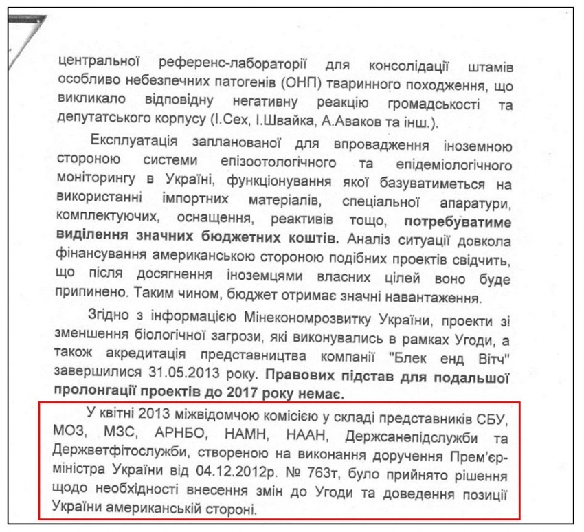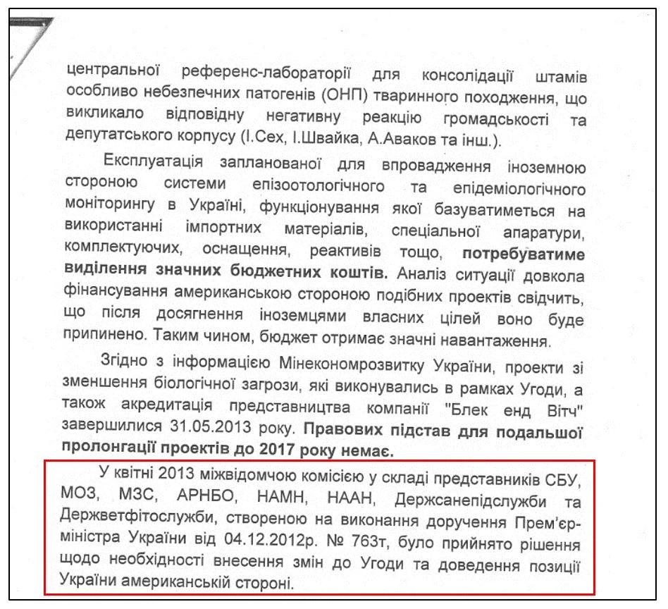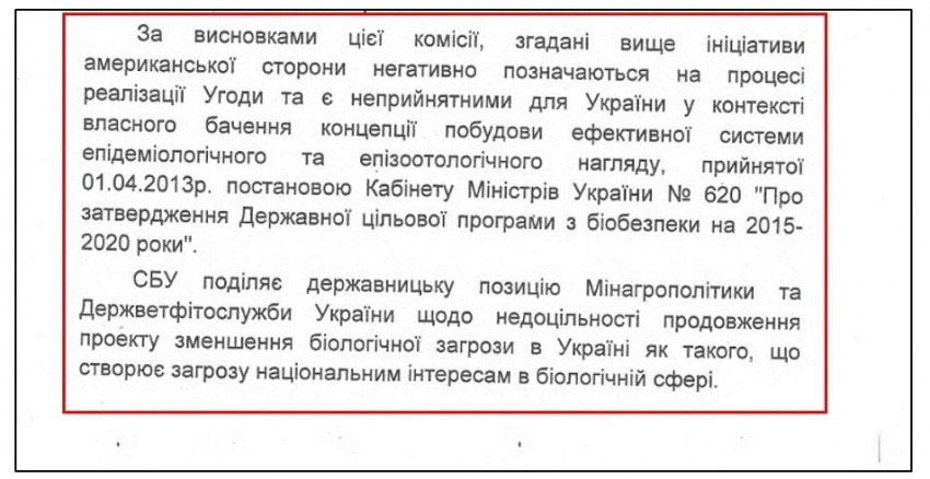 «… Исходя из выводов этой комиссии, указанные выше инициативы американской стороны негативно сказываются на процессе реализации Соглашения и являются неприемлемыми для Украины в контексте собственного видения концепции построения эффективной системы эпидемиологического и эпизоотологического надзора, принятой 01.04.2013 года постановлением Кабинета Министров Украины № 620 «Про утверждение государственной целевой программы биобезопасности 2015-2020 года.