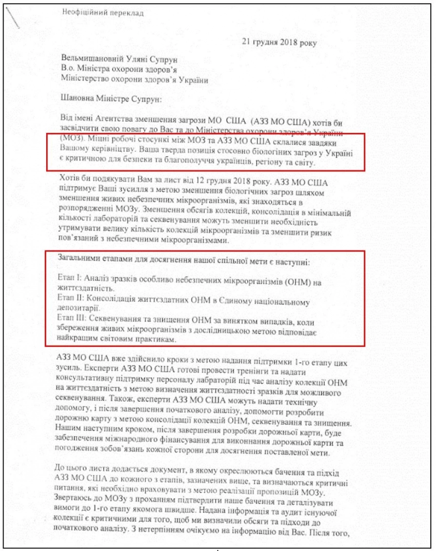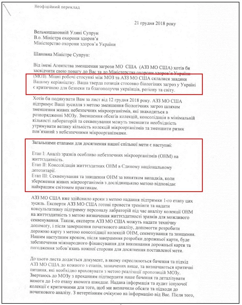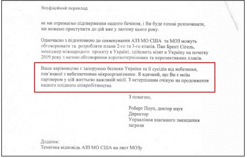 В своем письме директор управления взаимного уменьшения угрозы DTRA (АУУ) МО США Роберт Поуп не скрывает своего удовлетворения деятельностью главы минздрава Украины, в том числе связанной с допуском американских специалистов на украинские биообъекты и созданием Центрального депозитария: