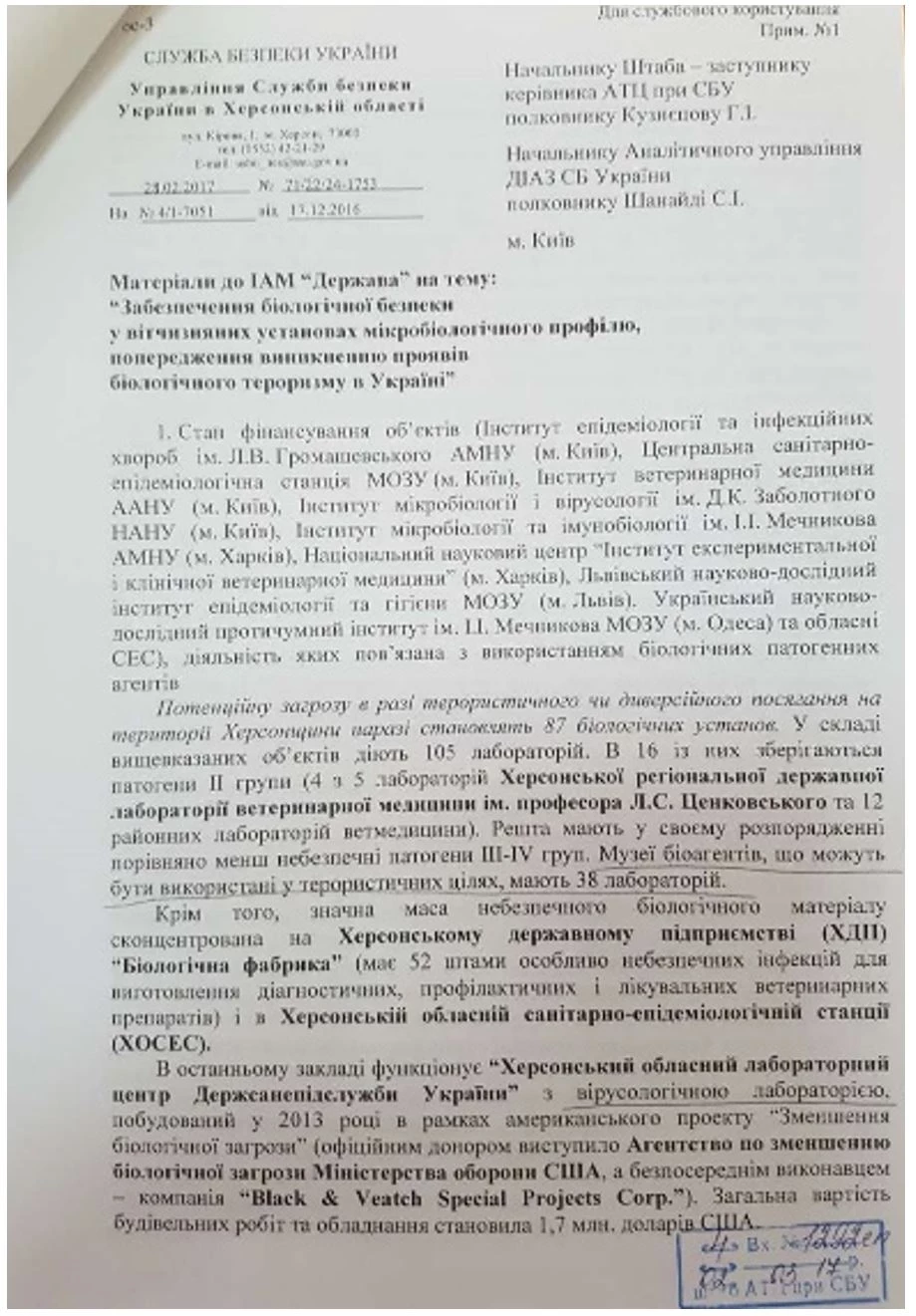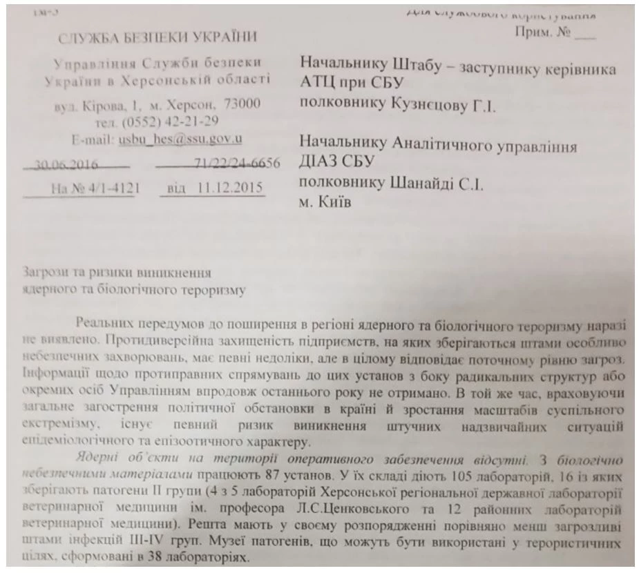 Докладная СБУ по биолабораториям:
