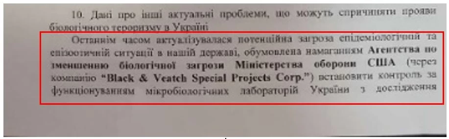 В 2017 году херсонское Управление СБУ также предупреждало АТЦ о потенциальной угрозе эпидемиологической и эпизоотической ситуации в стране, обусловленной деятельностью DTRA (АУУ) и ее подрядчика «Блек энд Витч Спешиал Проджектс Корп. Согласно выводам моих бывших коллег, США стремились установить контроль за исследованиями патогенов, которые могут быть использованы для создания новых типов биологического оружия.