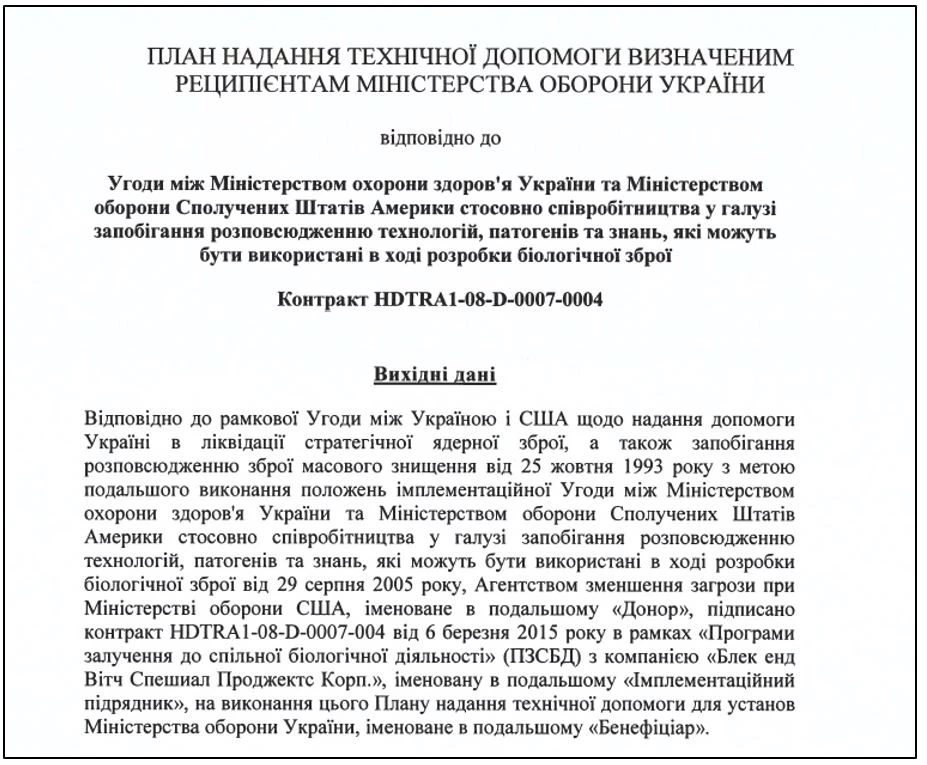 В 2005 году между министерством обороны США и министерством охраны здоровья Украины было заключено Соглашение в отношении сотрудничества в сфере недопущения распространения технологий, патогенов и знаний, которые могут быть использованы для разработки биологического оружия (далее – Соглашение). Со стороны американского военного ведомства реализацией проектов занималось агентство уменьшения угроз DTRA (АУУ).