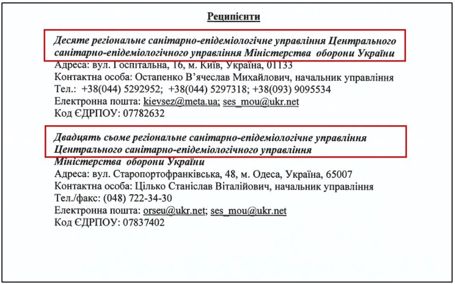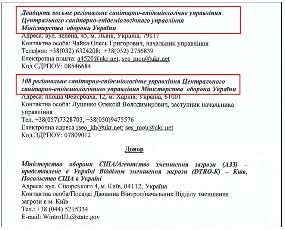 С украинской стороны опыты с участием военнослужащих курировало Центральное санитарно-эпидемиологическое управление ВСУ при поддержке 10 регионального СЭУ в г. Киеве, 27 регионального СЭУ в г. Одессе, 28 регионального СЭУ в г. Львове и 108 регионального СЭУ в г. Харькове.