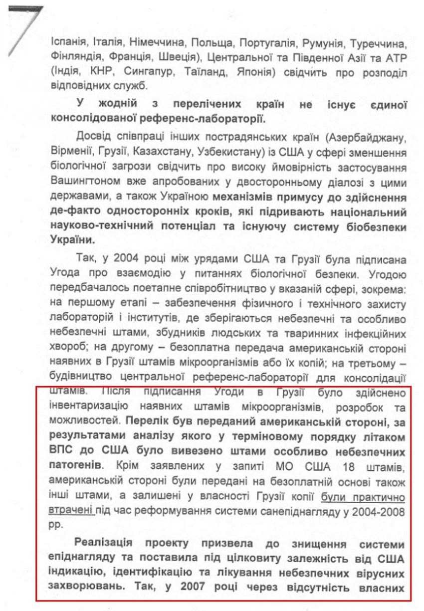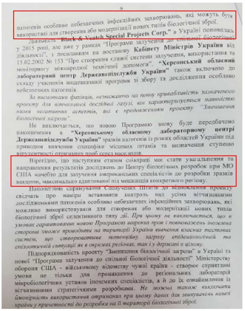 «…Настойчивые устремления Соединенных Штатов Америки к возобновлению проекта свидетельствуют о намерениях установить контроль над всеми отечественными исследованиями патогена особо опасных инфекционных заболеваний, который может быть использован для создания или модернизации новых типов биологического оружия селективного типа действия. При этом не исключается, что в условиях гарантированных новой Программой широких прав и полномочий иностранная сторона будет изучать на территории Украины собственные тестовые системы, что будет создавать потенциальную угрозу эпидемиологической и эпизоотической безопасности как в отдельных регионах, так и в государстве в целом.