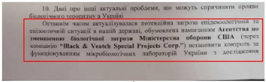 Цитата из документа УСБУ в Херсонской области:«Вероятно, что следующим этапом сотрудничества может стать обобщение и направление результатов исследований в Центр биологических разработок при МО США якобы для подключения американских специалистов к разработке образцов вакцин, максимально адаптированных под жителей конкретного региона.