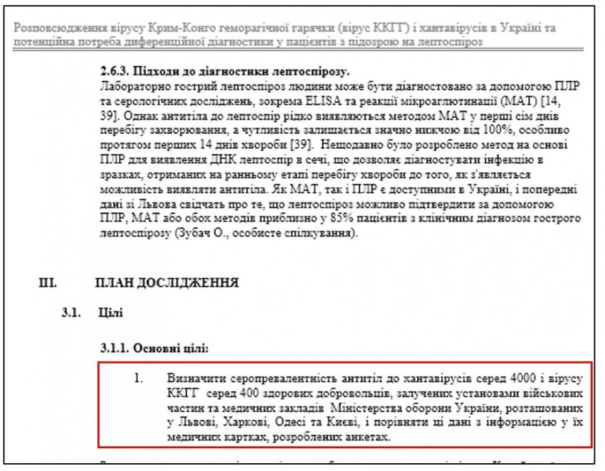 «Определить серопревалентность антител к хантавирусам среди 4000 и вируса ГЛКК среди 400 здоровых добровольцев, привлеченных учреждениями воинских частей и медицинских заведений Министерства обороны Украины, расположенных во Львове, Харькове, Одессе и Киеве, и сравнить эти данные с информацией в их медицинских карточках, разработанных анкетах.