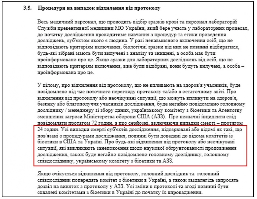 …Все случаи гибели субъектов исследования, предположительно или точно связанные с процедурами исследования, должны быть доведены до комитетов по биоэтике в США и Украине. О любых отклонениях от протокола или нештатных ситуациях, которые вызывают обеспокоенность относительно научной обоснованности продолжения исследования, будут немедленно поставлены в известность главный исследователь, помощник исследователя, украинский комитет по биоэтике и DTRA (АУУ).