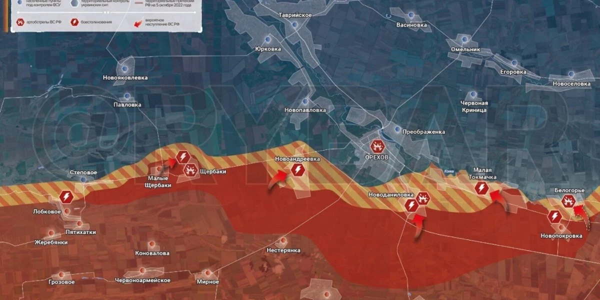 - Сразу же после ВС РФ смогли закрепить успех, заблокировав украинские формирования в Щербаках. Также российские бойцы продвинулись в пригородах Орехова — Новоандреевке, Новоданиловке и Малой Токмачке. В окрестностях продолжается зачистка.