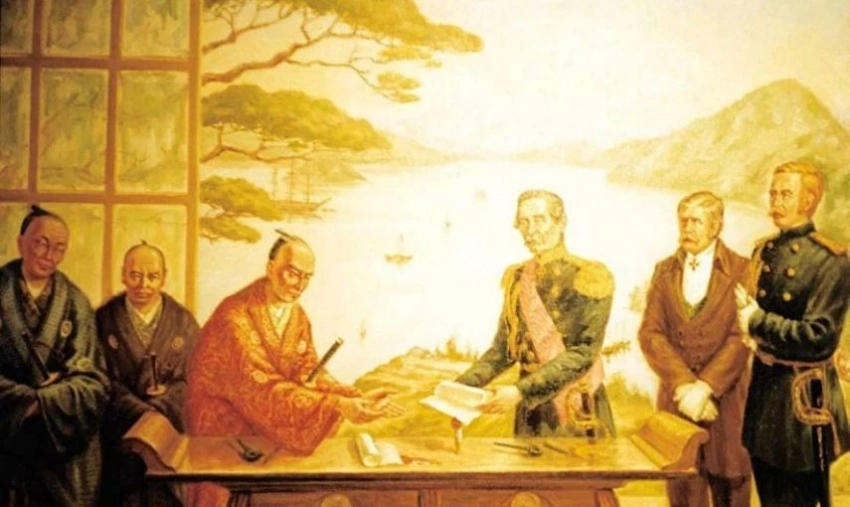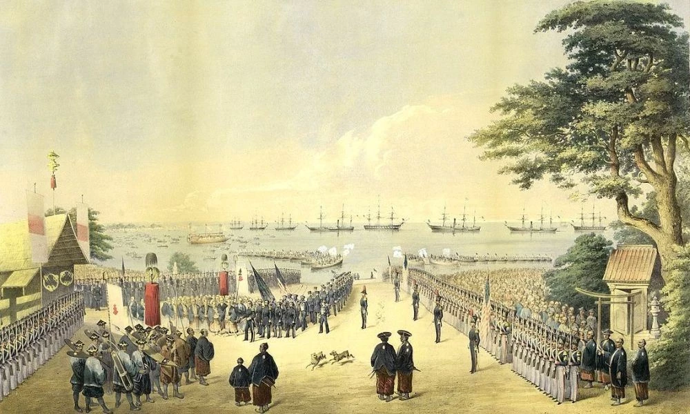 После неудачных попыток убедить Эдо (Токио) допустить американские суда в порты Японии правительство США направило в эту страну военную эскадру под командованием коммодора Мэтью Перри, одного из наиболее активных проводников политики Вашингтона на Дальнем Востоке. Вопреки установленному порядку эскадра прибыла не в Нагасаки, где осуществлялась международная торговля, а без согласования с японскими властями самовольно вошла в порт Урага, что в заливе Эдо (Токийском). Перри в грубой форме потребовал от правительства Японии заключить с США торговый договор и открыть ряд японских портов для регулярного посещения американскими кораблями, в том числе военными. В подтверждение решительности этих требований командующий эскадрой направил пушки своих кораблей в сторону японской столицы.
