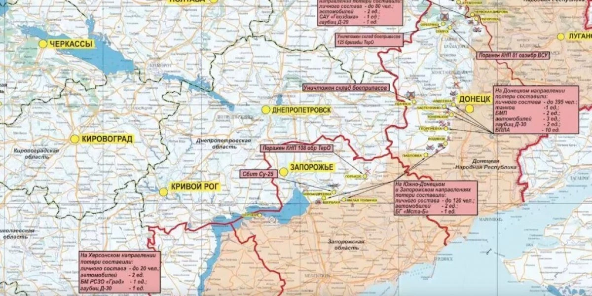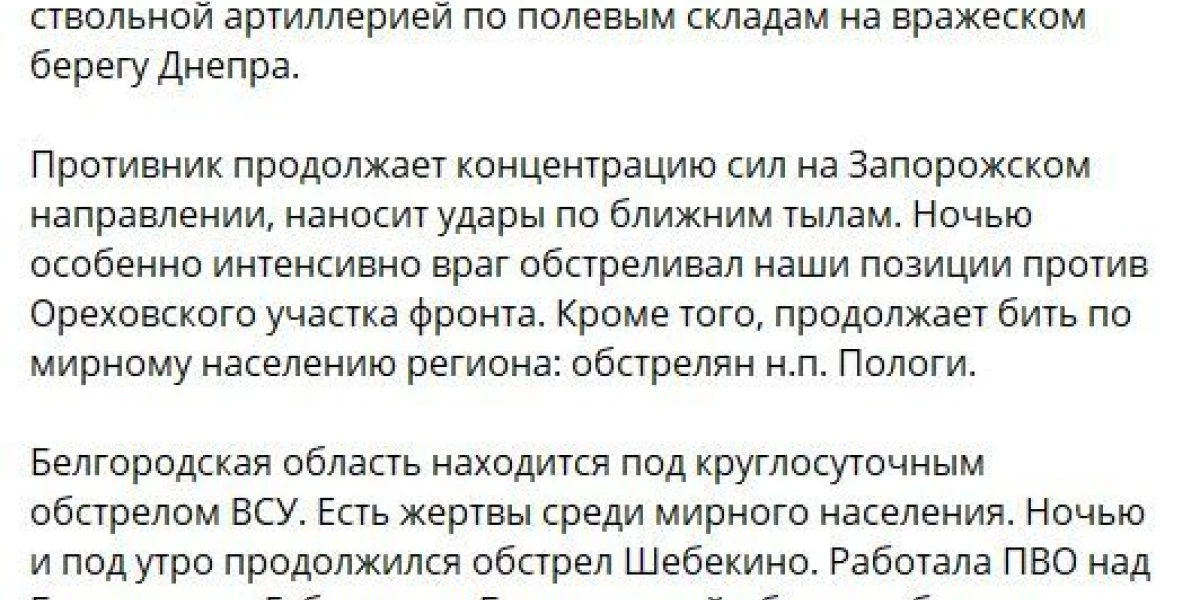 Южно-Донецком и Запорожском направлениях ударами авиации и огнем артиллерии группировки войск «Восток нанесено поражение подразделениям ВСУ в районах населенных пунктов Водяное, Павловка Донецкой народной республики, Малая Токмачка и Щербаки Запорожской области. За сутки на данных направлениях уничтожено до 120-ти украинских военнослужащих, два автомобиля, а также гаубица «Мста-Б.