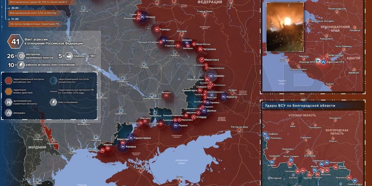 Карта боевых действий на Украине сегодня, к утру 2 июня 2023 г: СВО сегодня, день 464-й. Обзор событий: Армия РФ наступает по нескольким участкам фронта. Что происходит в Артемовске и Авдеевке, где сейчас идут бои, 02.06.2023 г. На Украине пригрозили новыми прорывами на территорию России не только в Белгород. Почему украинский конфликт может окончится у границы с Польшей Позиционные бои под Купянском, НАТО нарастит поддержку Киева. Система ПВО сбила несколько украинских беспилотников рядом с Курском. Минобороны рассказало о попытке украинских боевиков атаковать Шебекино. Командир Апты Алаудинов заявил об освобождении ВС РФ 70% Марьинки. Новости фронта Донбасса, обзор событий. Итоги СВО на Украине 02.06.2023 г, день 464-й. Сводка боевых действий. Карта СВО. Последний брифинг Минобороны РФ. Юрий Подоляка последние новости. Михаил Онуфриенко последнее видео.