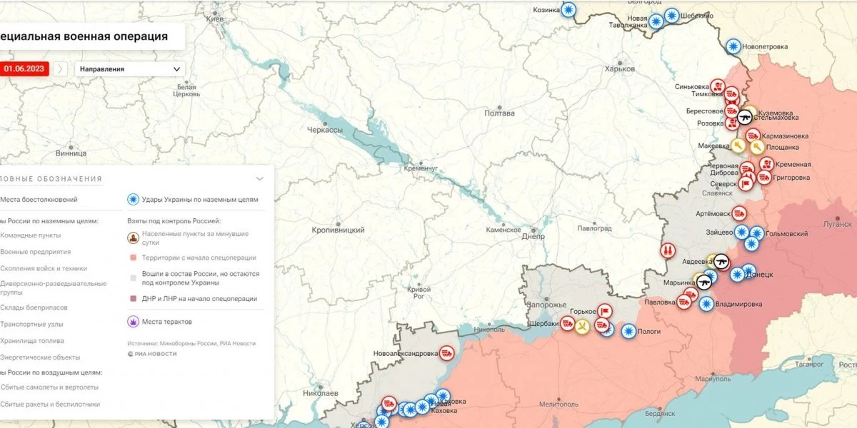 Карта боевых действий на Украине, к утру 2 июня 2023г., от РИА Новости. Карта специальной военной операции.