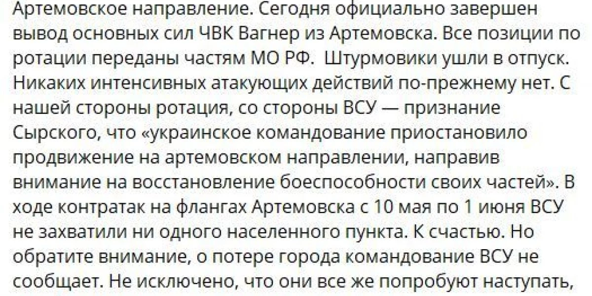 Артемовское направление: сегодня был завершен вывод подразделений ЧВК «Вагнер из Артемовска. Все позиции были переданы ВС РФ. Тем временем командование ВСУ «приостановило продвижение на флангах, якобы для восстановления боеспособности;