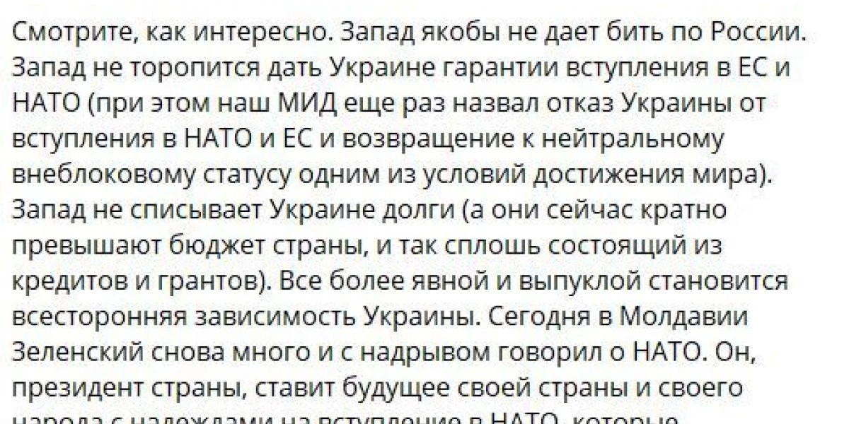 «Не только Германия, они там все не настроены на диалог. Самое главное, что на этот самый диалог не настроен Вашингтон, а эти все — подтанцовка США, которая исполняет волю хозяина. Их не устраивает диалог, так как ВСУ способны сопротивляться, так как поставки вооружений для украинской армии продолжаются. Вся эта история завязана на экономических интересах, — объяснил Александр Дудчак.