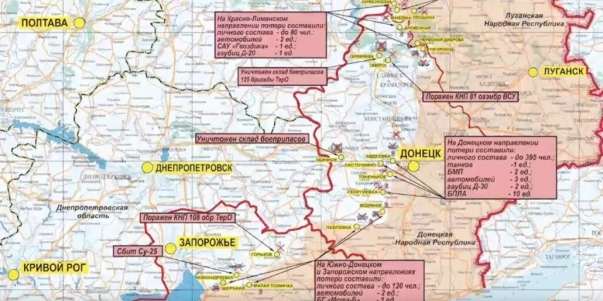За сутки на Донецком направлении уничтожено до 395-ти украинских военнослужащих, один танк, две боевые машины пехоты, три пикапа, а также две гаубицы Д-30. В районе населенного пункта Удачное Донецкой народной республики уничтожен склад боеприпасов ВСУ.