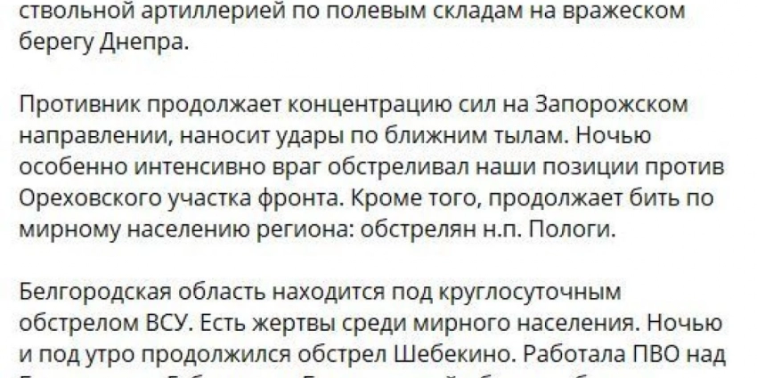 Вчера примерно в 04:00 (мск) после артобстрела противник в составе 30 боевиков и семи единиц бронетехники пытался атаковать в направлении Волчанска и международного автомобильного пункта пропуска Шебекино. Артиллерия Западного военного округа открыла огонь и уничтожила до десяти нападавших и боевую бронированную машину. Противник отошел в направлении Плетеневки.
