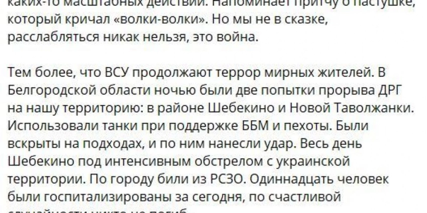 По последним данным, при обстрелах Шебекинского городского округа за сутки пострадали 12 человек, сообщил белгородский губернатор Вячеслав Гладков. Шебекино и окрестности обстреливали в течение всего утра из минометов и «Градов. По словам губернатора, ударам подверглась в том числе районная администрация. Также загорелось здание общежития.