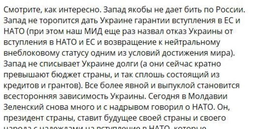 «Перемирие они захотят только тогда, когда ВСУ будет на грани разгрома. В этот самый момент они скажут: «ну вы же тогда говорили что-то про мирные договоренности. Но, скорее всего, будет предложено не завершить конфликт, а остановить его, заморозить, как мы видели это во всех этих «Минсках. То есть они захотят перегруппироваться, накопить силы и подготовиться к новому удару, — добавил политолог.