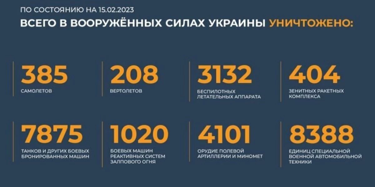 - Всего с начала проведения специальной военной операции уничтожены: 385 самолетов, 208 вертолетов, 3132 беспилотных летательных аппарата, 404 зенитных ракетных комплекса, 7875 танков и других боевых бронированных машин, 1020 боевых машин реактивных систем залпового огня, 4101 орудие полевой артиллерии и минометов, а также 8388 единиц специальной военной автомобильной техники.