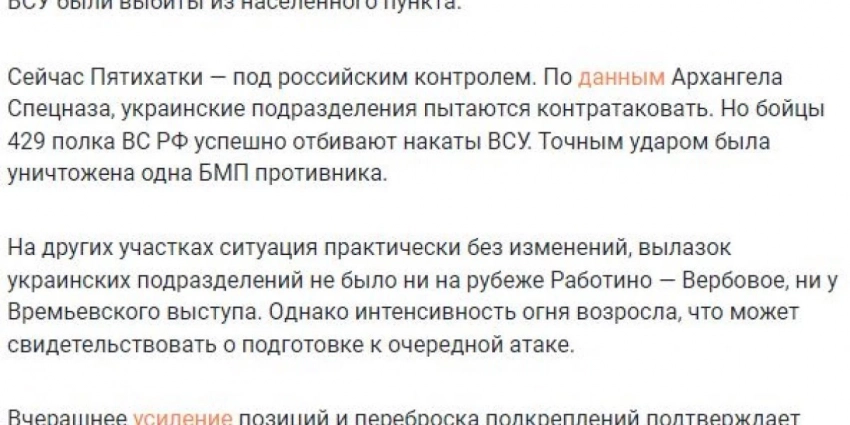 И все заходящие в Пятихатки силы противника уничтожаются российской артиллерией, танками либо авиацией. Более того, 5-ый батальон 128-й гшб ВСУ и вовсе вывел остатки своих сил и тяжелой техники из населенного пункта под натиском ВС РФ, которые занимают более выгодные позиции на высотах, в то время как ВСУ засели в низинах.