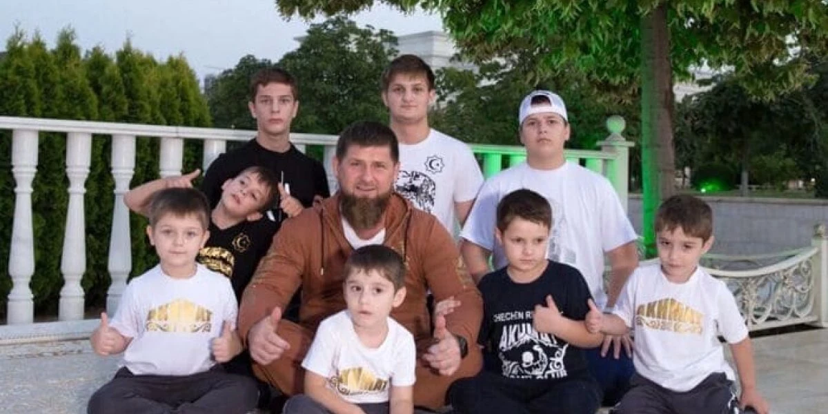 Рамзан Кадыров и все его 8 сыновей (родные и приемные). На заднем плане — 3 старших сына-погодки. Слева в белой футболке — младший родной сын Абдуллах. Перед Рамзаном и крайний справа — братья-близнецы. Мальчики в черных футболках 7-10 лет, возможно, приемные дети