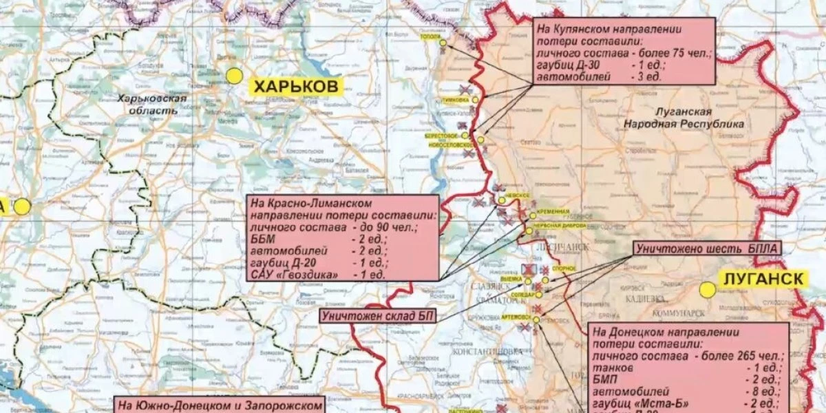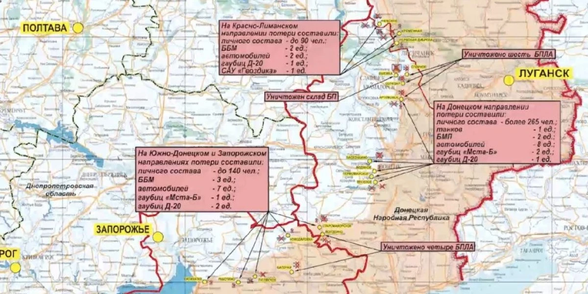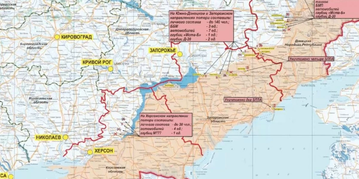 Потери противника за сутки на данных направлениях составили до 140 украинских военнослужащих, три боевые бронированные машины, семь автомобилей, две гаубицы Д-20, а также одна гаубица «Мста-Б.