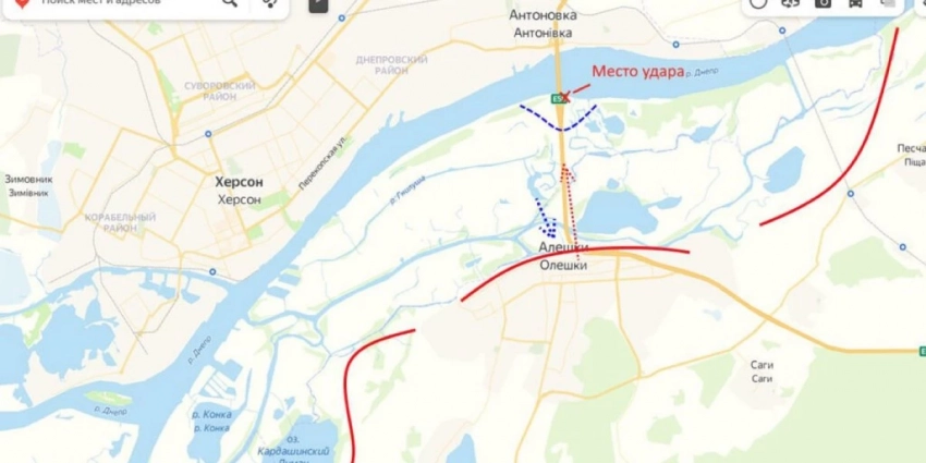 Сегодня утром российские войска нанесли мощный удар ОТРК «Искандер по остаткам Антоновского моста на левом берегу Днепра, где заняли плацдарм украинские формирования. После удара один из пролетов моста уцелел и ВС РФ продолжают работу по зачистке левого берега от ВСУ.
