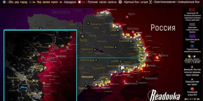 К югу от Бахмута ВСУ после артобстрелов атаковали в направлении Курдюмовки и заняли позиции на окраинах, оттеснив российские войска за канал Северский Донец — Донбасс. Также они продвинулись в сторону Клещеевки со стороны Предтечина и вышли к важной рокаде, которая идёт до Майорска. Российские войска попытались атаковать в направлении Ступочек. Об опасности этих действий для ВС РФ с учётом их выступающих позиций мы уже говорили. А после того, как украинская армия атаковала и продвинулась в направлении Клещеевки со стороны Ивановского, российским подразделениям угрожает окружение. В самом Бахмуте при поддержке артиллерии ЧВК «Вагнер ведёт штурмовые действия уже только в западной и северной части. Есть продвижение. Встречные бои у Хромового. ВСУ атаковали со стороны Богдановки. Российские войска отошли к Берховке, заняв позиции за водохранилищем. К северо-востоку от Соледара ВСУ при поддержке артиллерии продвинулась к донецкой Белогоровке. ВС РФ вели обстрелы Белой Горы, Александро-Шультина, города Константиновка, Ивановского, Часова Яра, Маркова, Новомаркова, Орехово-Васильевки, Васюковки, Весёлого, Спорного и Верхнекаменского.)