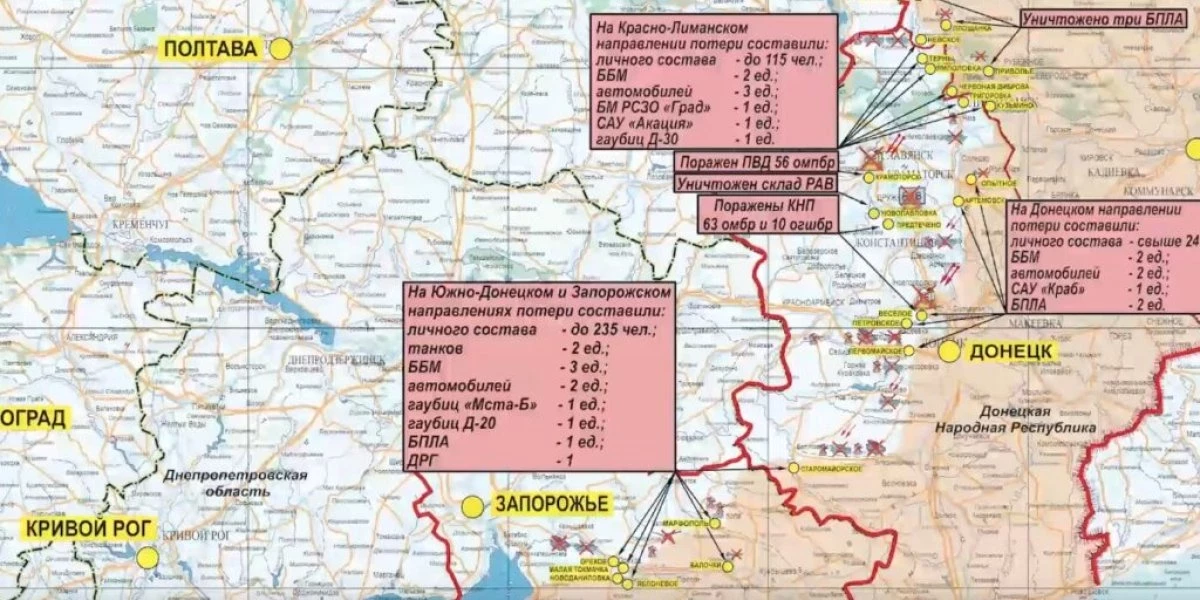 В течение последних суток российские бойцы ликвидировали на донецком направлении самоходную артиллерийская установку Krab, 3 бронированные боевые машины, 2 танка. Убито 235 украинских военных. Российская армия отразила атаки войск противника на нескольких направлениях.