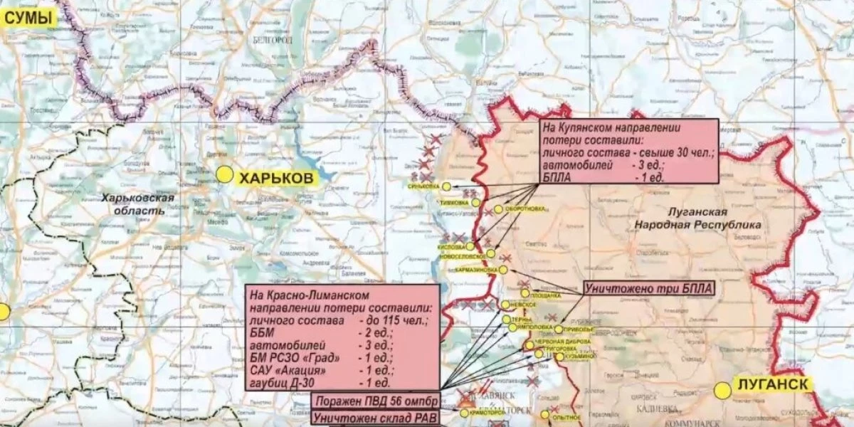 Кроме того, в районе населенного пункта Тимковка Харьковской области уничтожена украинская диверсионно-разведывательная группа. Потери противника составили свыше 30-ти украинских военнослужащих, а также три автомобиля.