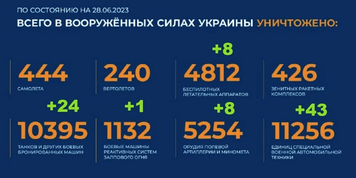 Потери Украины на сегодня 28.06.2023 Всего с начала проведения специальной военной операции уничтожено: 444 самолета, 240 вертолетов, 4812 беспилотных летательных аппаратов, 426 зенитных ракетных комплексов, 10395 танков и других боевых бронированных машин, 1132 боевые машины реактивных систем залпового огня, 5254 орудия полевой артиллерии и минометов, а также 11256 единиц специальной военной автомобильной техники.