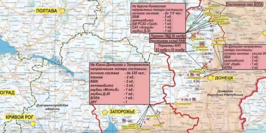 Общие потери противника на данных направлениях за сутки составили до 235-ти украинских военнослужащих, два танка, три боевые бронированные машины, два автомобиля, а также гаубицы Д-20 и «Мста-Б.