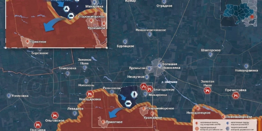 В дополнение к этому было отражено два нападения украинской армии в направлении села Старомайорское. По информации МО РФ, в районе населенного пункта отработала авиация, артиллерия и ТОС группировки войск «Восток.