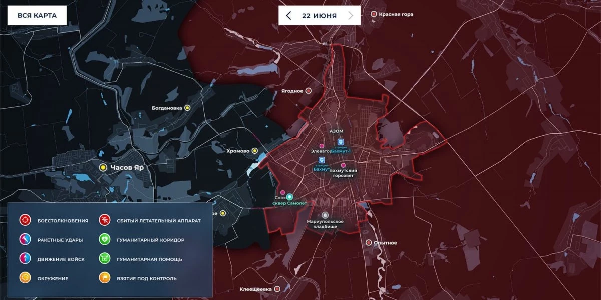 Карта боевых действий на Украине сегодня, обстановка 22 июня 2023 года от Mash. Бои на Артёмовском направлении