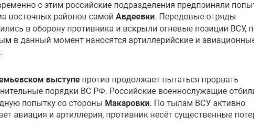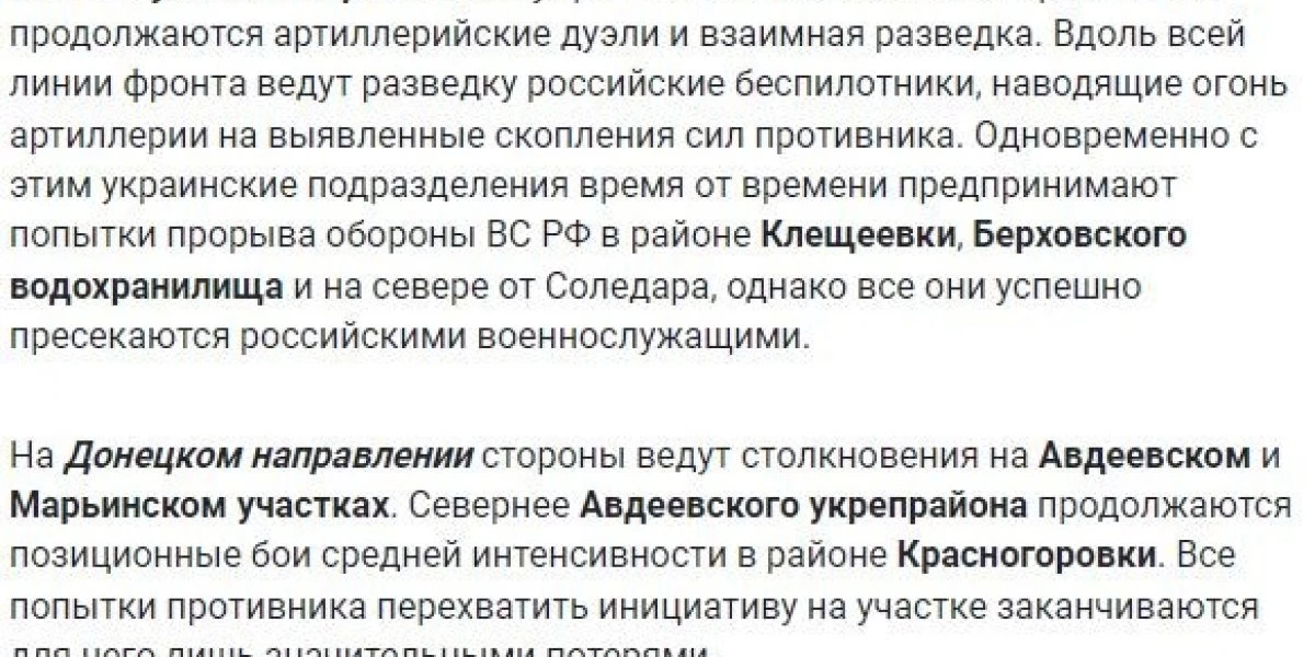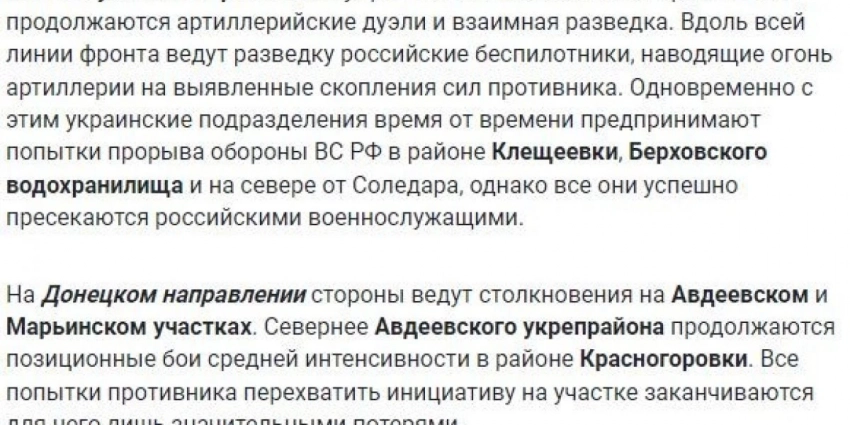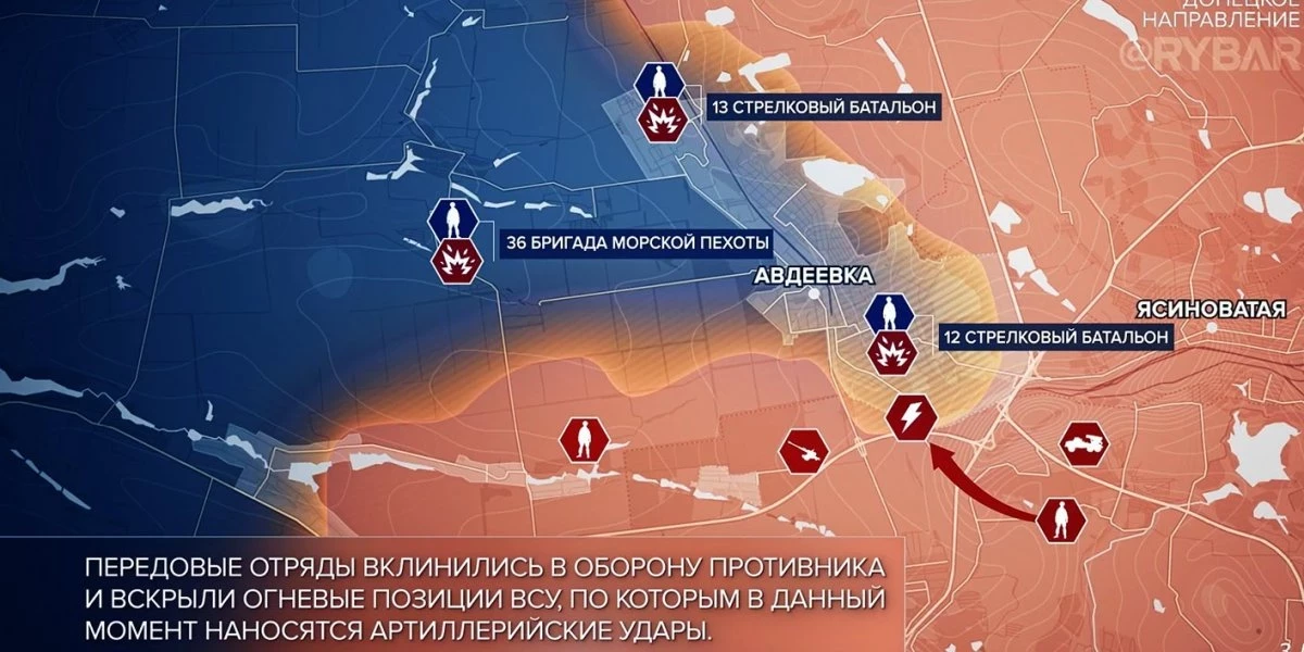 Бойцы российской армии штурмовали вражеские позиции на юго-западных подступах к Авдеевке. В Марьинке не прекращаются попытки продвинуться на западных окраинах. Также ВС РФ атаковали в районах Победы и Новомихайловки.