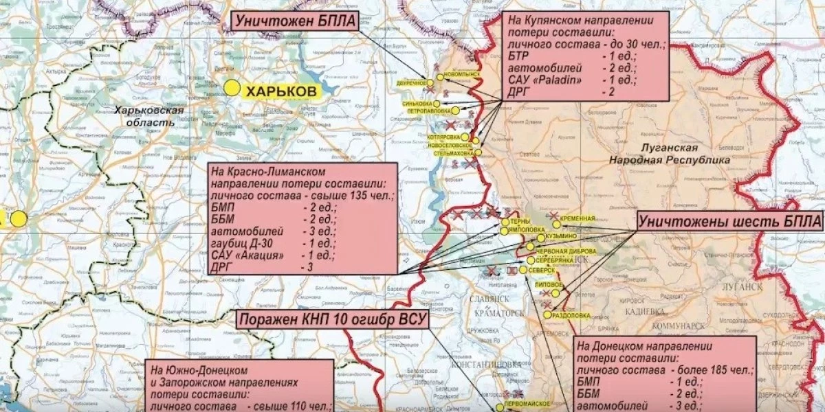 На Купянском направлении оперативно-тактической и армейской авиацией, артиллерией «Западной группировки войск поражена живая сила и техника ВСУ в районах населенных пунктов Новомлынск, Петропавловка, Котляровка и Стельмаховка.