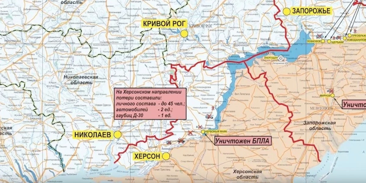 На Херсонском направлении в результате огневого поражения в течение суток уничтожено до 45-ти украинских военнослужащих, два автомобиля, а также гаубица Д-30.