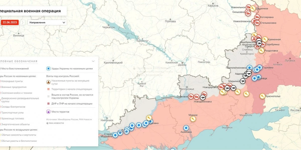 Карта боевых действий на Украине сегодня, обстановка 22.06.2023 г. от Mash.