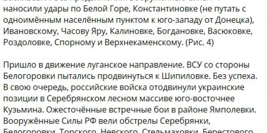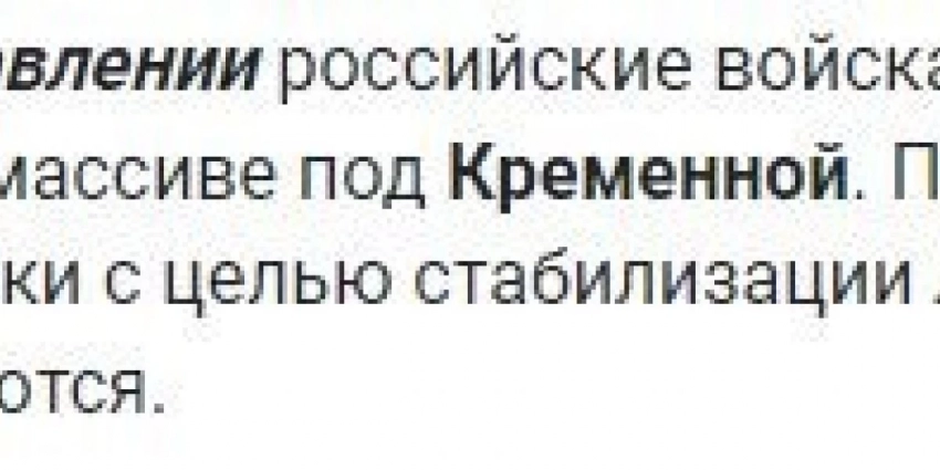 На Сватово-Кременном направлении российская армия успешно продвигается в лесном массиве к северо-востоку от Купянска и к западу от Кременной. Также ВС РФ отбили атаки боевиков в Серебрянском лесу.