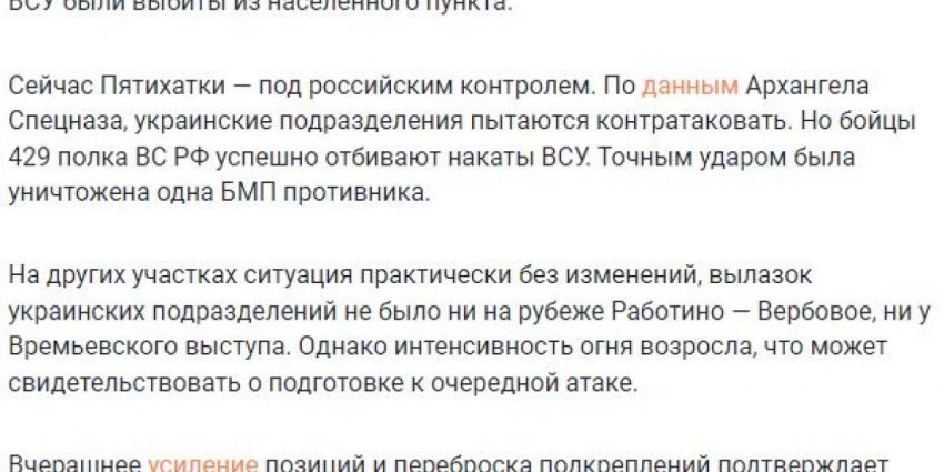 Пятихатки в серой зоне, идут ожесточенные бои, но боевики не могут закрепиться в селе. На Ореховском и Гуляйпольском участках позиционные бои, активно работает российская артиллерия. На Времьевском выступе обстановка за сутки сильно не изменилась.