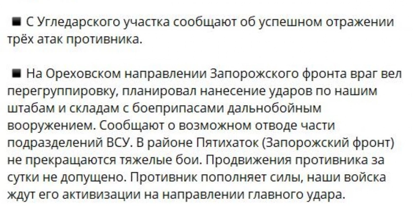 ВСУ на Угледарском участке атаковали в районах Ровнополя, Старомайорского и Урожайного, продвинуться не сумели. На Донецком фронте российские войска вели наступление у Новомихайловки и на юго-западных подступах к Авдеевке. Кроме того, военкор Семен Пегов сообщает о контратаке ВС РФ у Орехово-Василевки на Артемовском направлении.