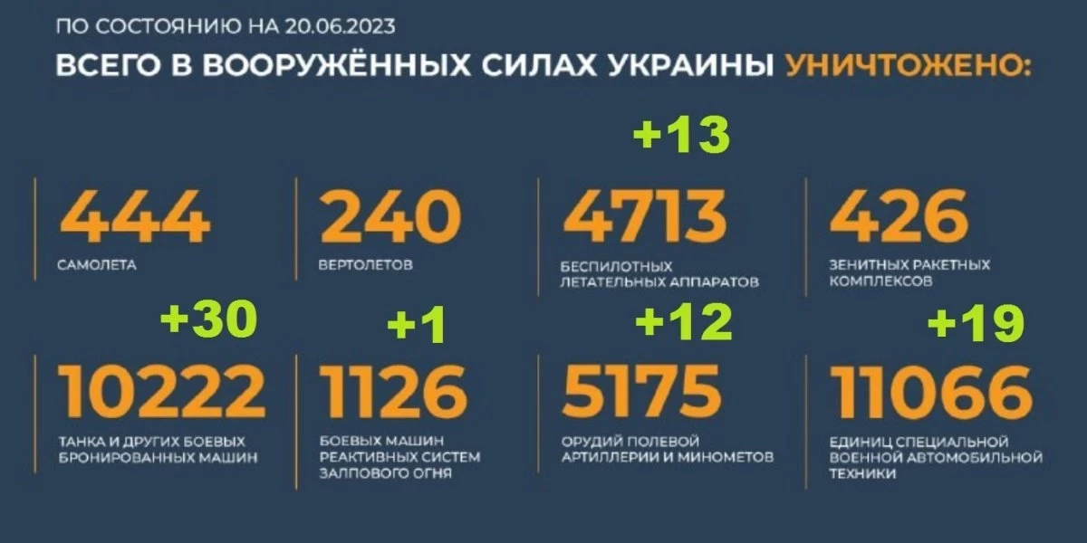 ? Всего с начала проведения специальной военной операции уничтожено: 444 самолета, 240 вертолетов, 4713 беспилотных летательных аппаратов, 426 зенитных ракетных комплексов, 10222 танка и других боевых бронированных машин, 1126 боевых машин реактивных систем залпового огня, 5175 орудий полевой артиллерии и минометов, а также 11066 единиц специальной военной автомобильной техники.